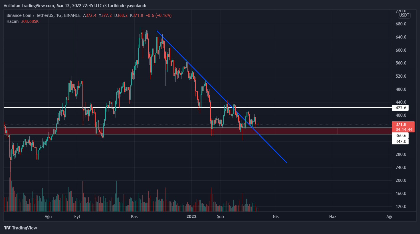 Günlük grafikte bulunan düşen trendini kırmış olan BNB, 360 – 340 dolar desteğinin üzerinde konumlanmaya devam ediyor.