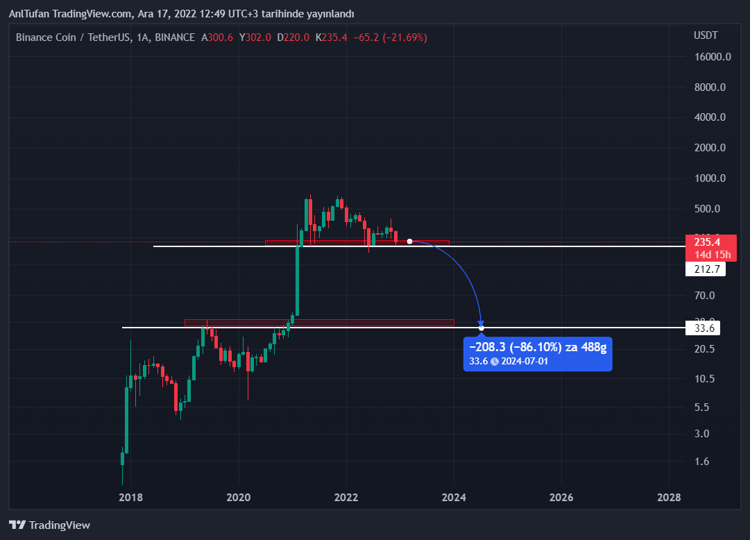 İlerleyen süreçte BNB’nin 200-220 dolar desteğinin altında aylık kapanışlar gerçekleştirmesi, 35-40 dolar seviyelerine kadar yüzde 85’lik bir düşüş yaşamasına sebebiyet verebilir.