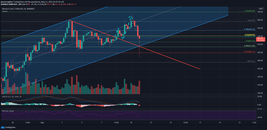 4 saatlik grafiğe bakıldığında fiyatın Mart ayının son haftasından bu yana gelen bir yükselen kanalı daha önce kırdığı ve yeniden içine döndüğü görülüyor. Son düşüşlerle bu kanalın altına inen ancak şu anda yeniden içeride kalan BNB, fibonacci düzeltmesindeki 640 dolarda dirençle karşılaşıyor.
