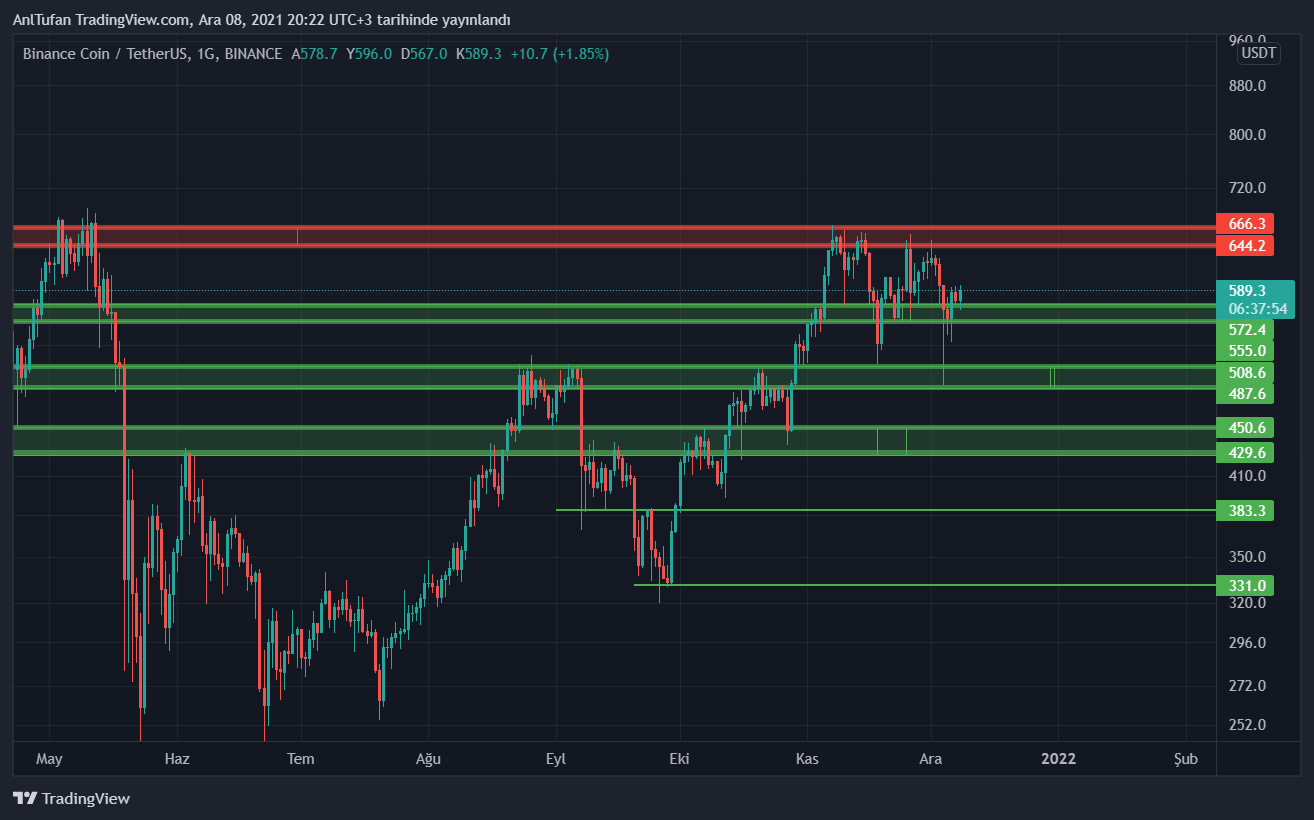 644 – 666 dolar seviyelerinde bulunan direncinden düşüşe geçmesi durumunda tekrardan 570 – 555 dolar desteğine kadar gerileyebilecek olan BNB, bu destek seviyesi altında kapanışlar yapması durumunda, 508 dolar desteğine bir düşüş yaşayabilir gibi duruyor.