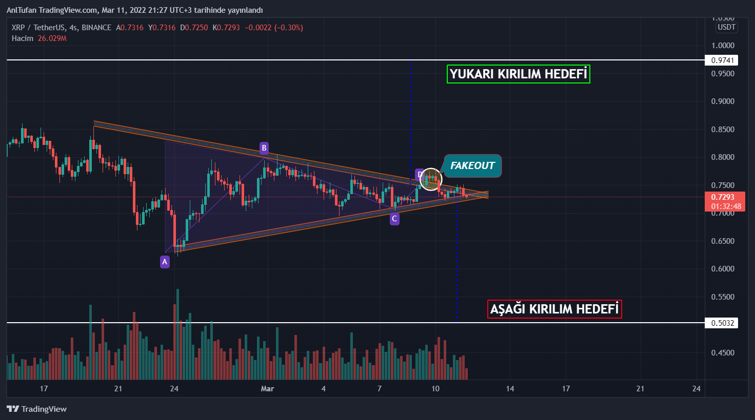 Bu kırılım ardından yükseliş yapması beklenen XRP, tekrar üçgen içine sarkarak bir fakeout hareketi gerçekleştirdi.