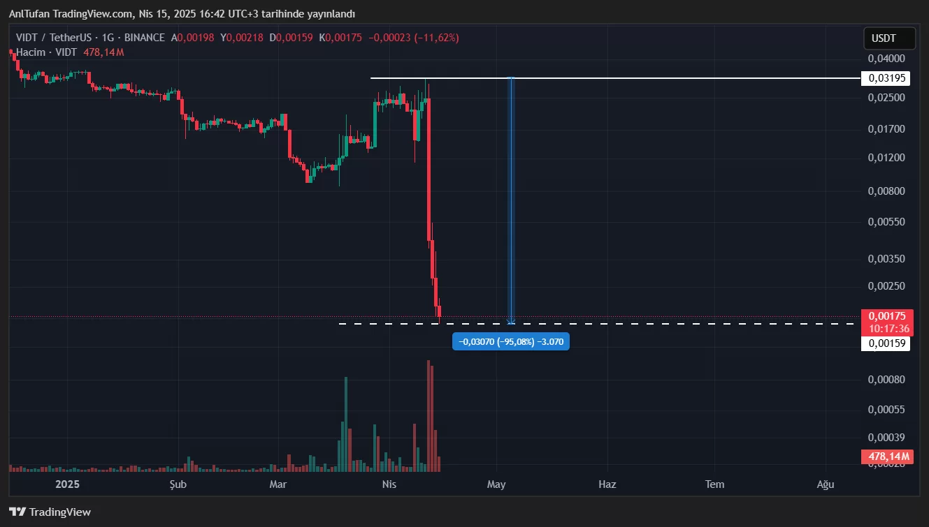 Binance 8 Nisan tarihinde VIDT dahil olmak üzere 14 altcoin’i platformundan kaldıracağını duyurmuştu. Bu duyuru sonrasında VIDT fiyatında devasa düşüşler meydana gelmişti.