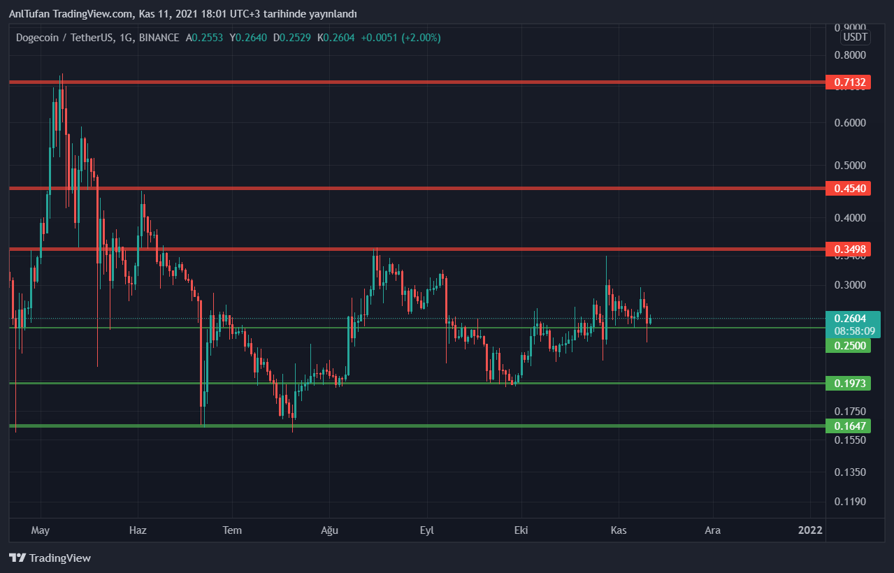 0.2500 dolar seviyesinin güzel bir direnç olmasına rağmen Dogecoin’in bir meme coin olması sebebiyle bu desteğin altına sarkabilir. %20’lik bir düşüş ile 0.2000 dolar ana destek seviyelerine kadar bir düşüş yaşayabilir.