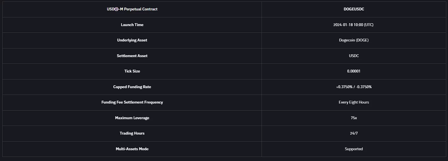 Gelen bilgilere göre Binance Dogecoin‘i (DOGE) USDC teminatıyla 75 kata kaldıraçla vadeli piyasada listeliyor. Binance daha öncede USDTUSDC, BTCUSDC, ETHUSDC, BNBUSDC, SOLUSDC ve XRPUSDC vadeli sözleşmelerini başlatmıştı.