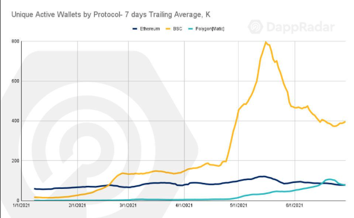 Binance Coin’in 600 dolar üzerine yükseldiği anlarda bu yükselişin yakıtını sağlayan Binance Smart Chain, 2021’nin ikinci çeyreğinde en çok kullanılan blockchain ağı oldu. DappRadar tarafından aktarılan bilgilere göre Binance SMart Chain söz konusu dönemde 421.854 cüzdan ile en fazla tekil cüzdan sayısına ulaşan ağ oldu. Bunun 2021’nin ilk çeyreğine kıyasla %400 yükselişe işaret etmesi aslında yükselişin ve popülerlik artışının ne kadar fazla olduğunu göstermekte.