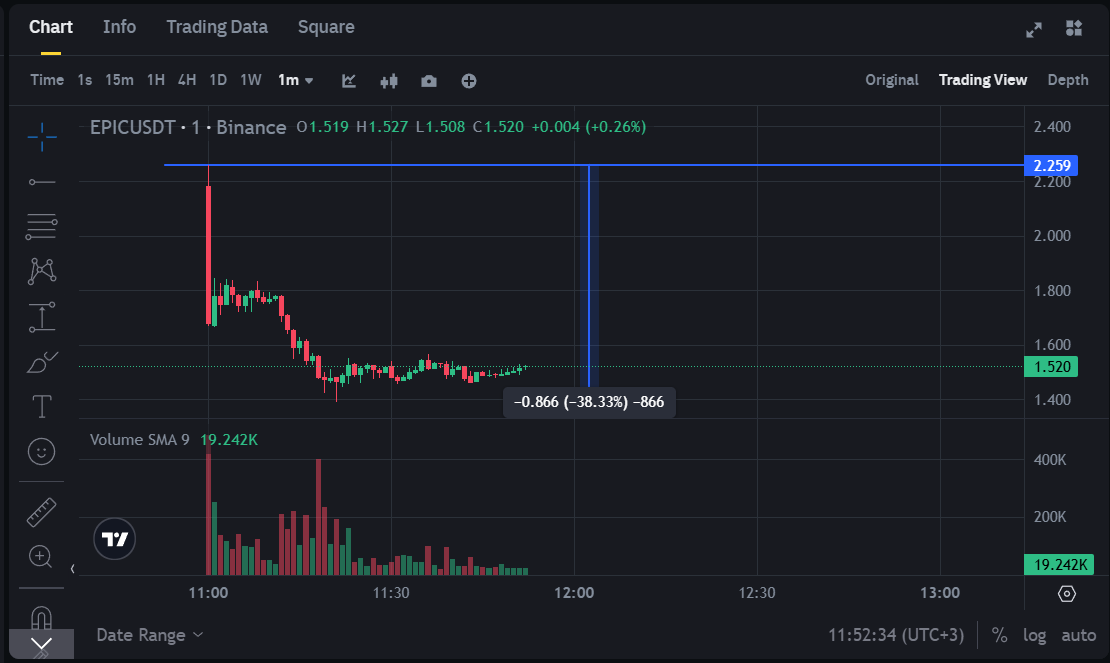 Geçtiğimiz dakikalarda Binance’de tekrardan işlem görmeye başlayan EPIC, ilk açılışını 2.25 dolardan yaptı. Sonrasında ise EPIC yoğun bir satış baskısıyla karşı karşıya kalarak %38’lik bir düşüş yaşadığı görüldü.