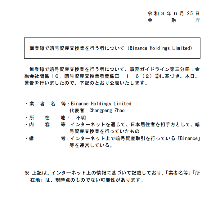 Japonya’nın finansal regülatörü FSA, Binance’e bir uyarı yayınlayarak borsanın hiçbir lisans olmadan ülkede hizmet verdiğini vurguladı. Binance’in aldığı uyarı Mayıs ayında Bybit kripto para borsasına da yapılmıştı.