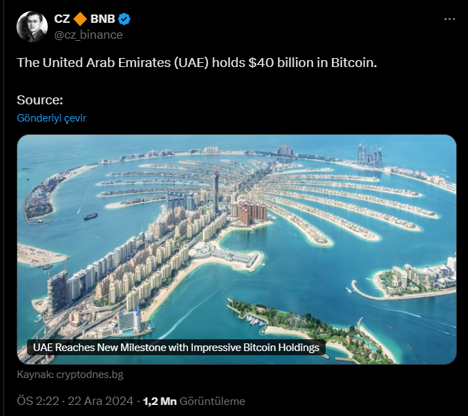 Dünyanın en büyük kripto para borsası Binance‘in kurucusu Changpeng Zhao (CZ), kısa bir süre önce yeni bir paylaşım yaptı. CZ’nin resmi X/Twitter hesabından yapılan paylaşıma göre Birleşik Arap Emirliklerinin (BAE) 40 milyar dolar değerini aşkın Bitcoin‘i (BTC) bulunuyor.