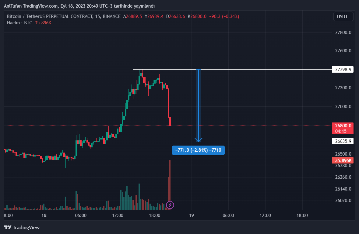 Son gerçekleştirilen satışlar ile birlikte bir anda 26.600 dolar seviyelerine gerileyen BTC, birçok long pozisyon açan yatırımcının likit edilmesine neden oldu.