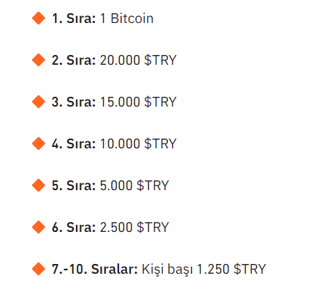 1. sıradaki kullanıcımız tam tamına 1 BTC’nin sahibi olacak. Ödül yapısı aşağıdaki gibidir:”
