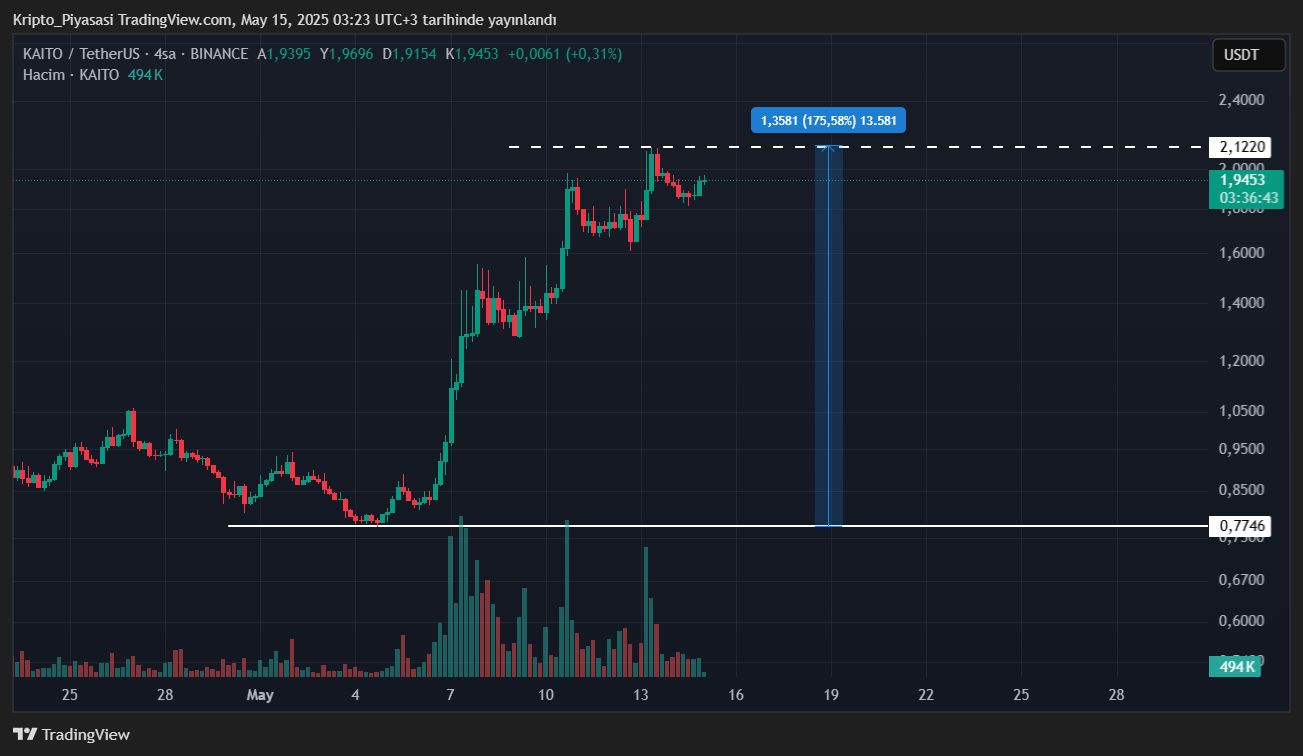 Dev kripto para borsası Binance‘de listelenmiş bir altcoin olan Kaito (KAITO), sergilediği performans ile yatırımcıların dikkatini çekmeye devam ediyor. Son 10 gün içerisinde %150’lük bir yükseliş yaşamayı başaran KAITO, yeni bir boğa trendi başlatmış gibi gözükmekte.