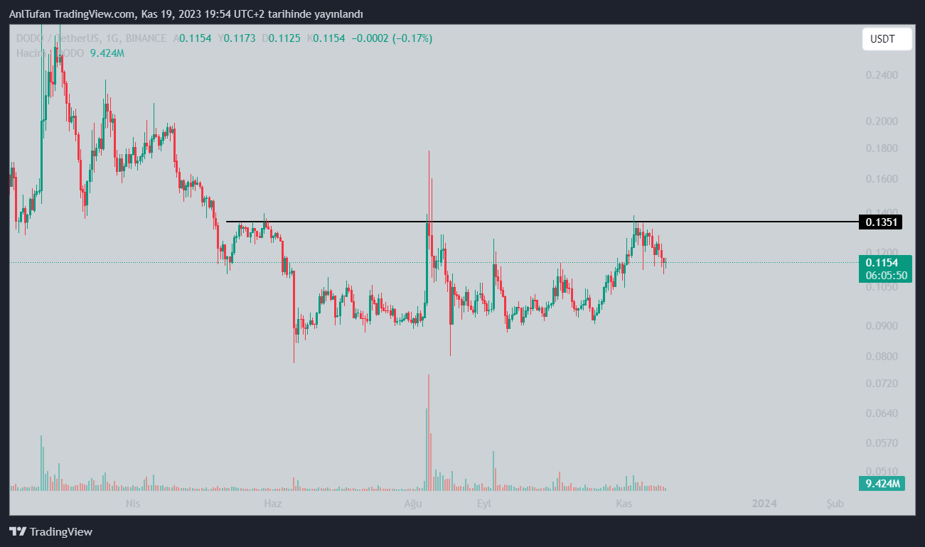 Birçok denemeye rağmen bu direnç noktasını (0.13 dolar) aşamayan DODO, major direnç noktasını kırması halinde ise volatil sıçramalar gerçekleştirebilir gibi duruyor.