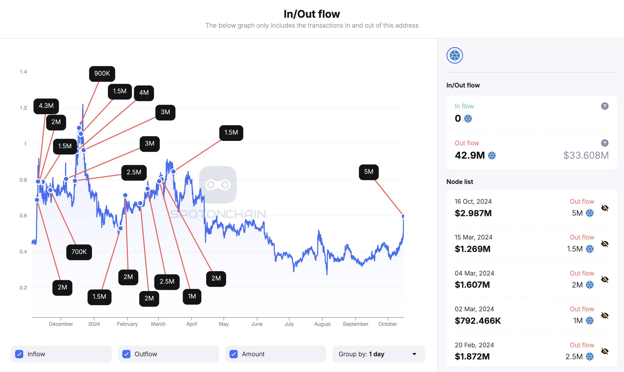 Görünüşe göre Kasım 2023 ile Mart 2024 arasındaki benzer bir deseni takip ediyorlar; bu dönemde fiyat artışlarından sonra ortalama 0,809 dolar fiyatla 37,9 milyon adet STORJ’u (30,6 milyon dolar değerinde) Binance’e yatırıp satmışlardı.”