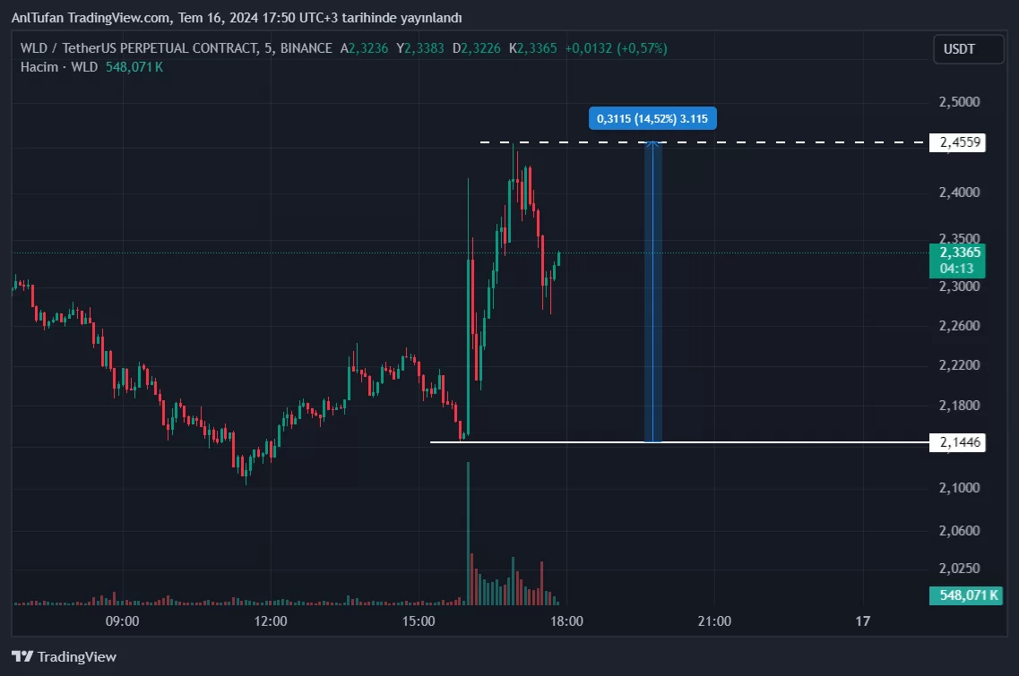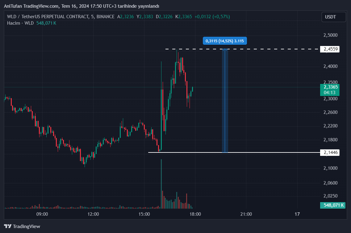 Bu gelişme ile birlikte Binance‘de listelenmiş olan Worldcoin (WLD) yükselişe geçti. WLD son gelen haberler sonrasında vadeli piyasada %15 oranında değer kazanarak 2.45 doları gördü.