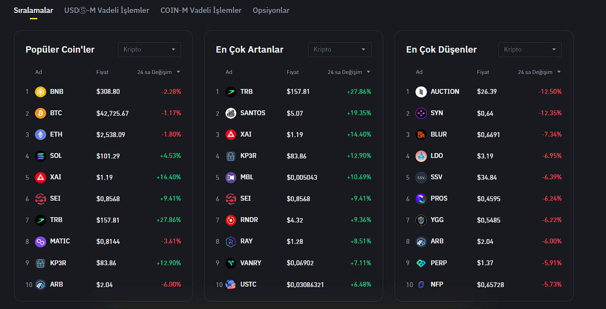 Hadi gelin Binance’de listelenmiş altcoin’lerin son 24 saatteki performansına yakından birlikte inceleyelim: