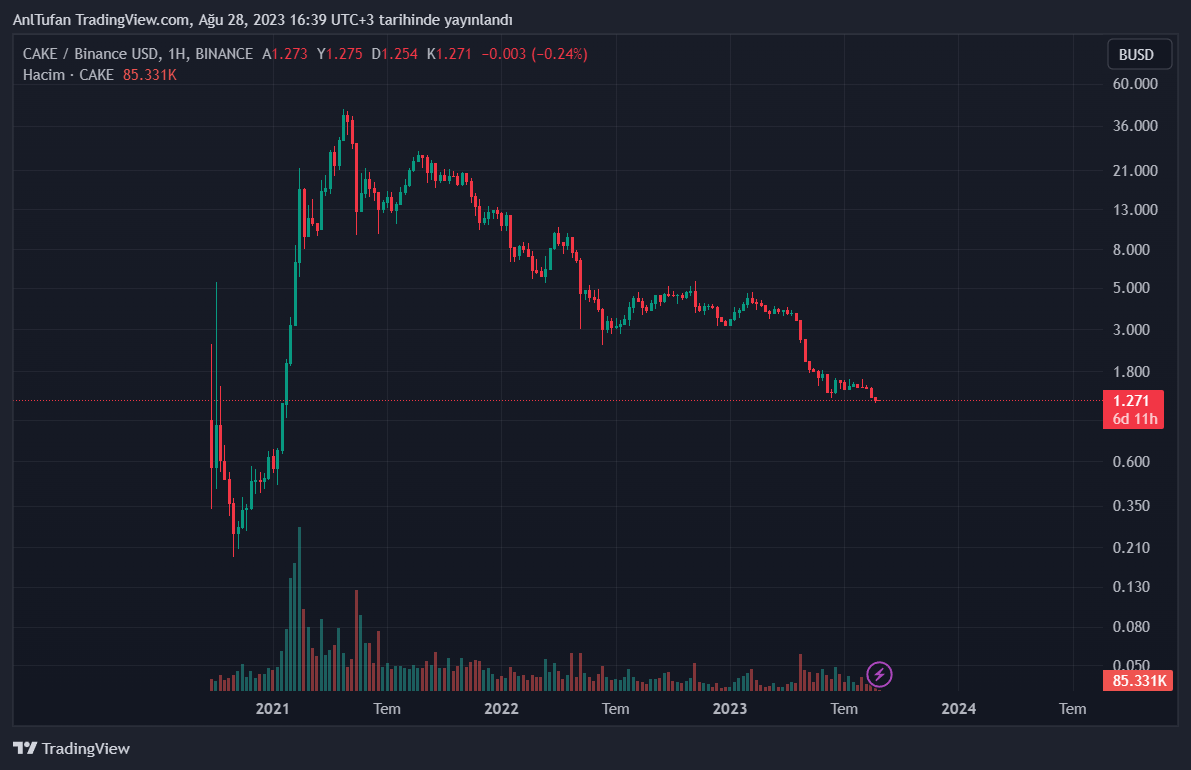Haberimizin yazıldığı esnada 1.27 dolar seviyelerinden işlem gören PancakeSwap (CAKE), istikrarlı bir şekilde düşüş yaşamaya devam ediyor.
