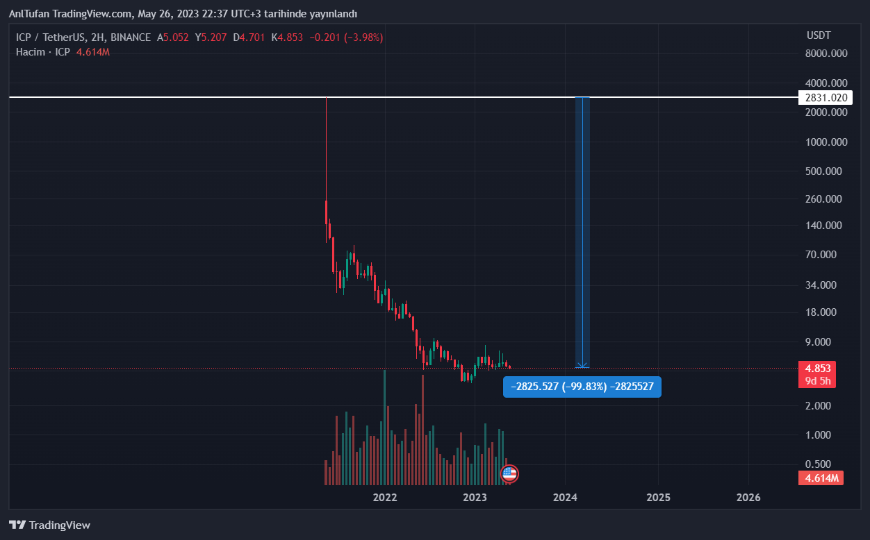 Binance’deki ICP/USDT paritesine baktığımızda, Internet Computer’da devasa bir çöküşün yaşandığı görülüyor. ICP bu kadar yüksek piyasa değerine sahip olsa da, iğne attığı zirve seviyesi 2.831 dolar seviyesinden yüzde 99.83 oranında geride işlem görmekte.