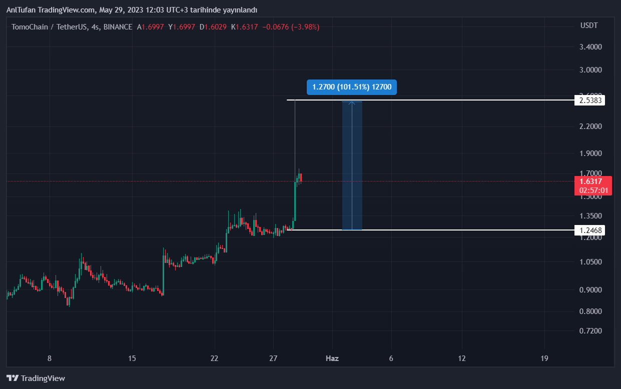 Bir anda gelen alıcı baskısı ile birlikte yüzde 100 oranında değer kazanmayı başaran TOMO, çok kısa bir süre içerisinde 2 kat artmış gibi gözüküyor.