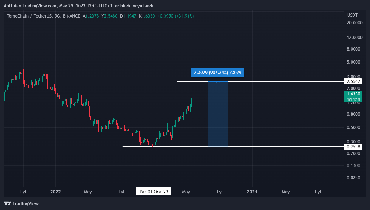 İşlem hacmine göre dünyanın en büyük kripto para borsası Binance‘de listelenmiş bir proje olan Tomo Chain (TOMO), 2023 yılının ilk 5 ayında toplamda yüzde 900’dan fazla yükseliş yaşamayı başardı.