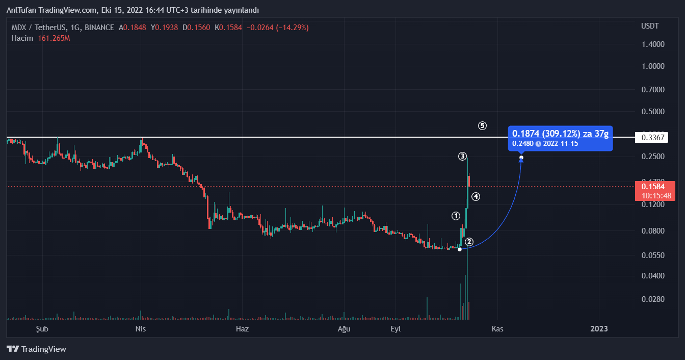 4. dalganın da tamamlanması ile birlikte 5. yükseliş dalgası için 0.3367 dolar direncine kadar bir yükseliş yaşayabilecek olan MDX, yatırımcılarına kazandırmaya devam edebilir.