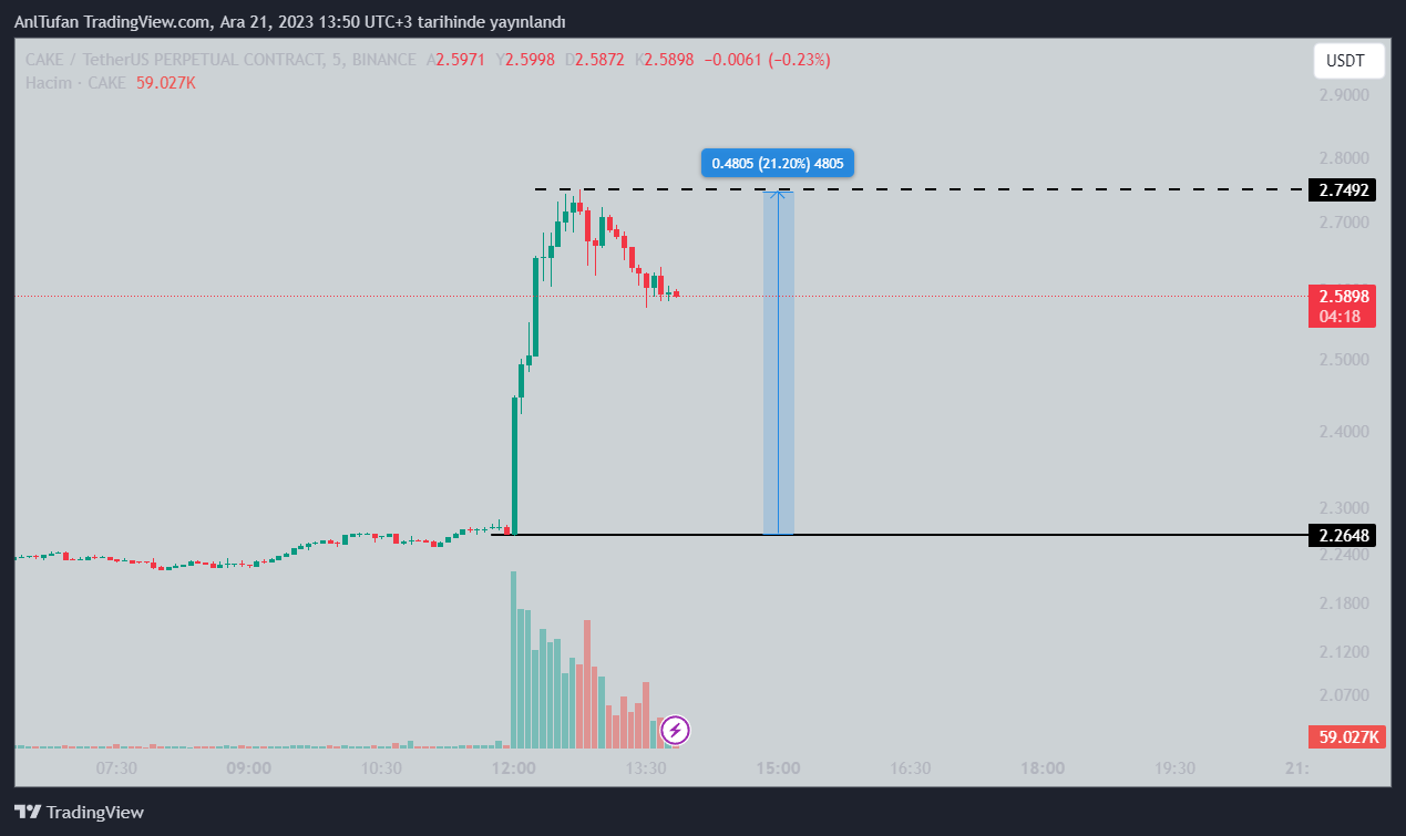 Bu gelen haber ile birlikte CAKE fiyatında ani bir artış meydana geldi. Çok kısa bir süre içerisinde %20 oranında değer kazanmayı başaran CAKE, son dakikalarda ise kademe kademe düşüş yaşıyor.