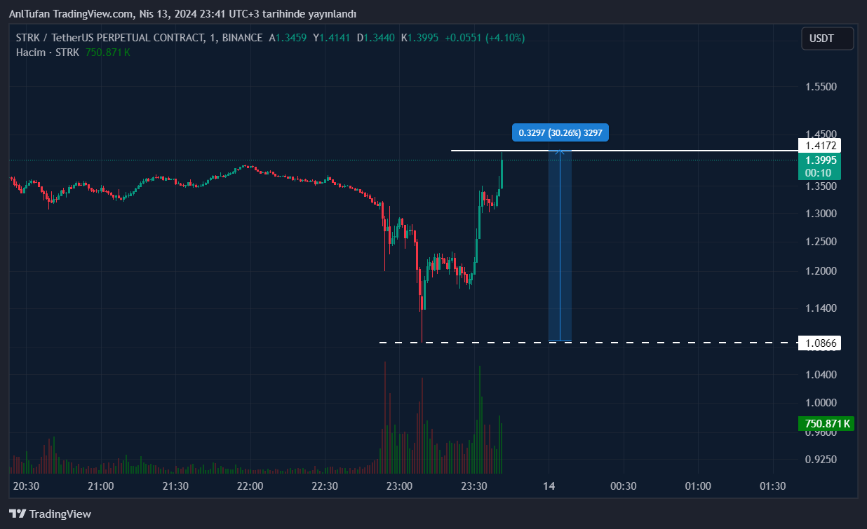 Binance‘de listelenmiş bir proje olan STRK, son dakikalardaki İsrail gelişmeleri ile birlikte 1.08 dolara iğne attı ve ardından yukarı yönlü volatil hareketler sergilemeye başladı.