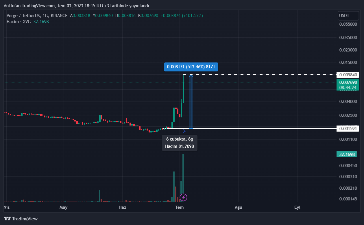İşlem hacmine göre dünyanın en büyük kripto para borsası Binance‘de de listelenmiş bir proje olan XVG, son 1 hafta içerisinde toplamda yüzde 500’den fazla yükseliş yaşadı.