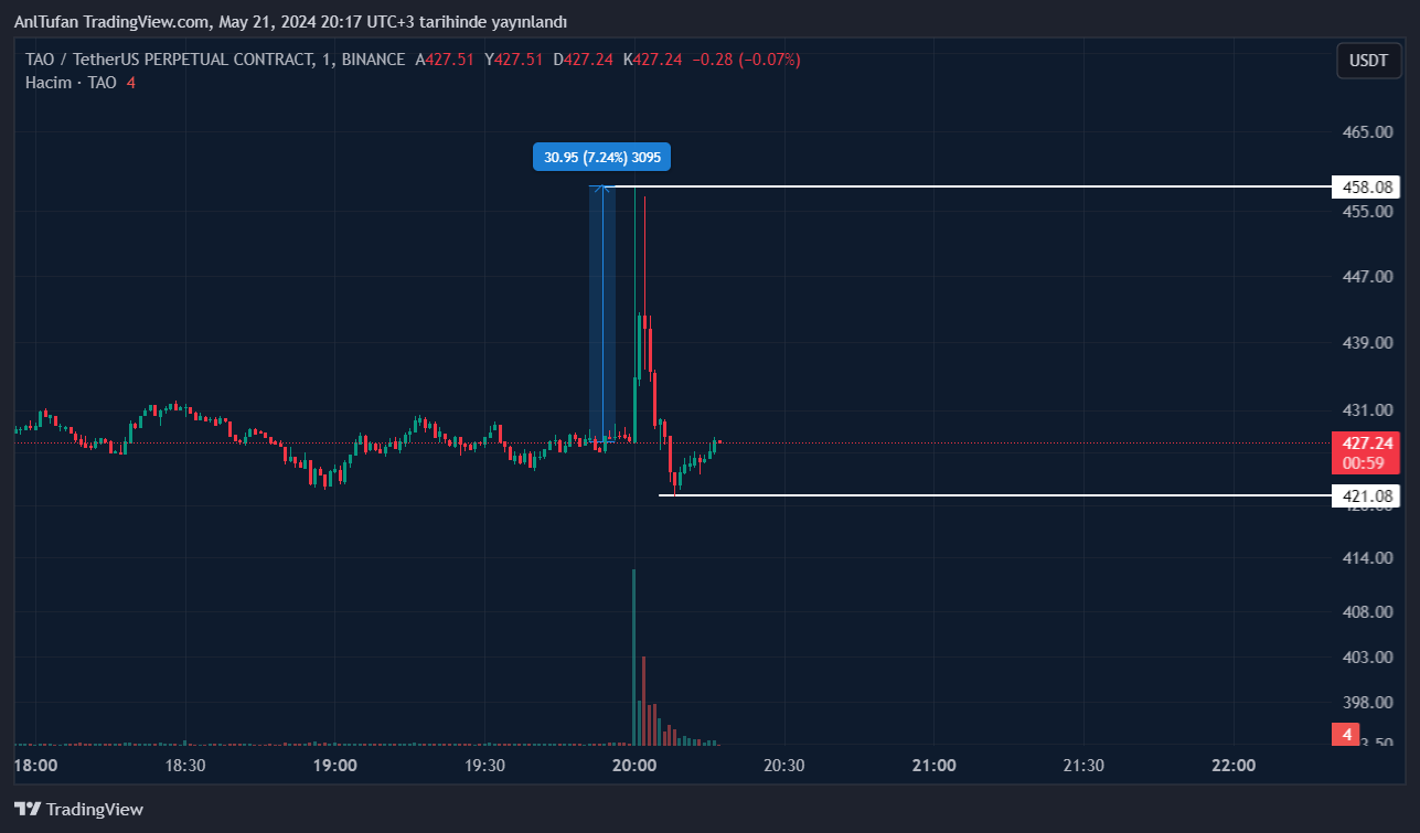 Binance vadeli piyasada 458 dolar seviyelerine kadar bir yükseliş yaşayan TAO, olayın sahte olduğunun ortaya çıkması ile birlikte eski seviyesinin altına sarktı ve 421 dolara kadar geriledi.