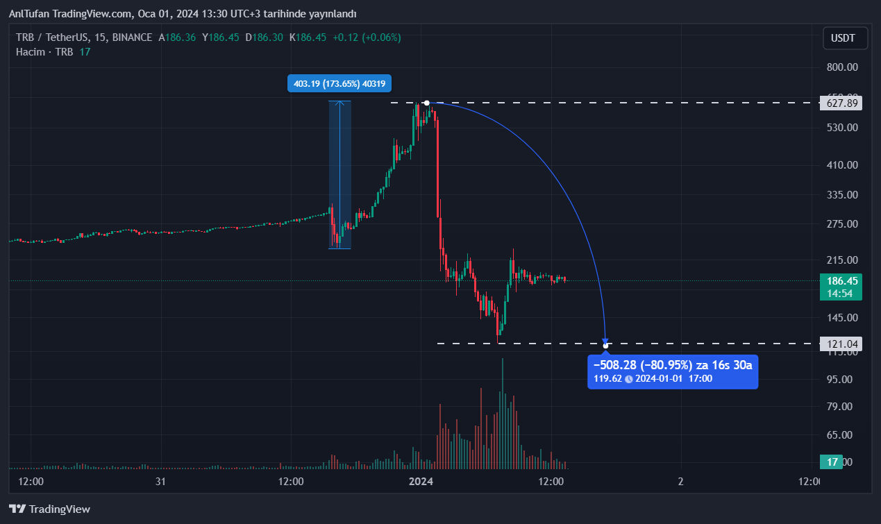 İlk etapta 300 dolardan birkaç dakika içerisinde 230 dolar seviyelerine %25’lik bir düşüş yaşayan TRB, sürecin ilerlemesiyle birlikte ise 627 dolara kadar yükseliş yaşadı.