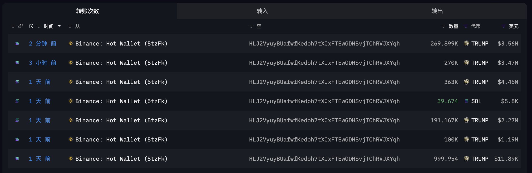Kayıtlı kullanıcılar arasında en çok TRUMP bulunduran adres (kayıtlı “MeCo”), yemek planının duyurulmasının ardından Binance’den toplam 1.195 milyon adet TRUMP (15.76 milyon dolar değerinde) çekti.”