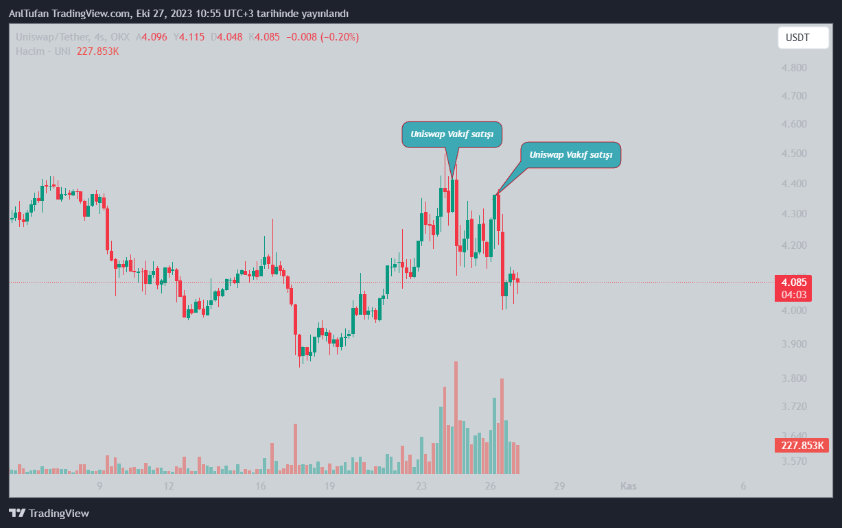 Şuan itibariyle 2 kere UNI satışı gerçekleştiren Uniswap Vakfı, 2’sinde de UNI’nin sert düşüşler yaşamasına neden oldu. Önümüzdeki süreçte vakfın satışları UNI’de çok daha büyük düşüşleri tetikleyebilir.
