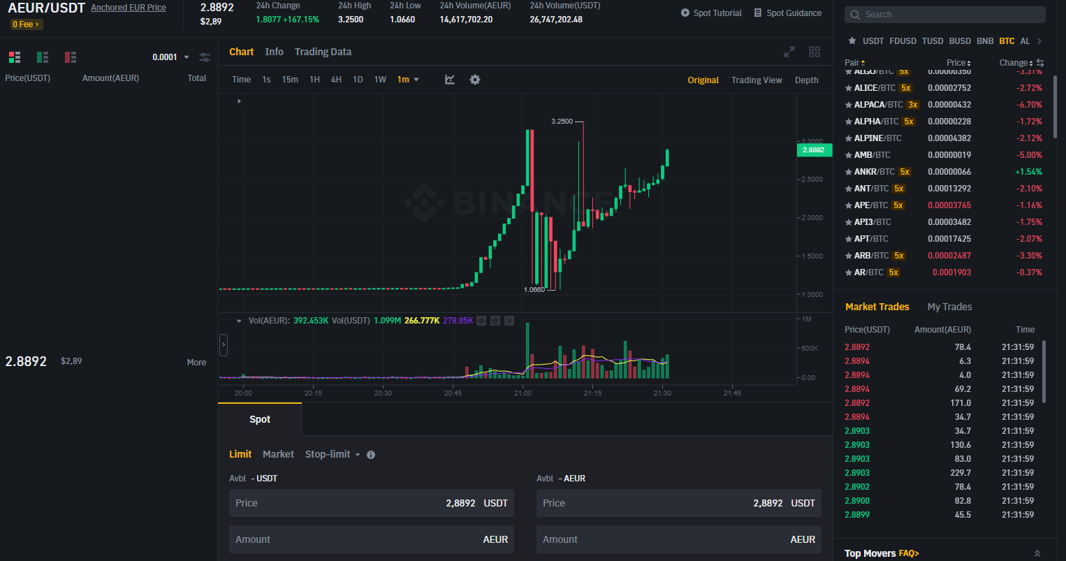 Binance AEUR ile yapılan alım satımlardan işlem ücreti almıyor. Piyasanın yükselmesiyle AEUR’a dahi ilgi artmışa benziyor.