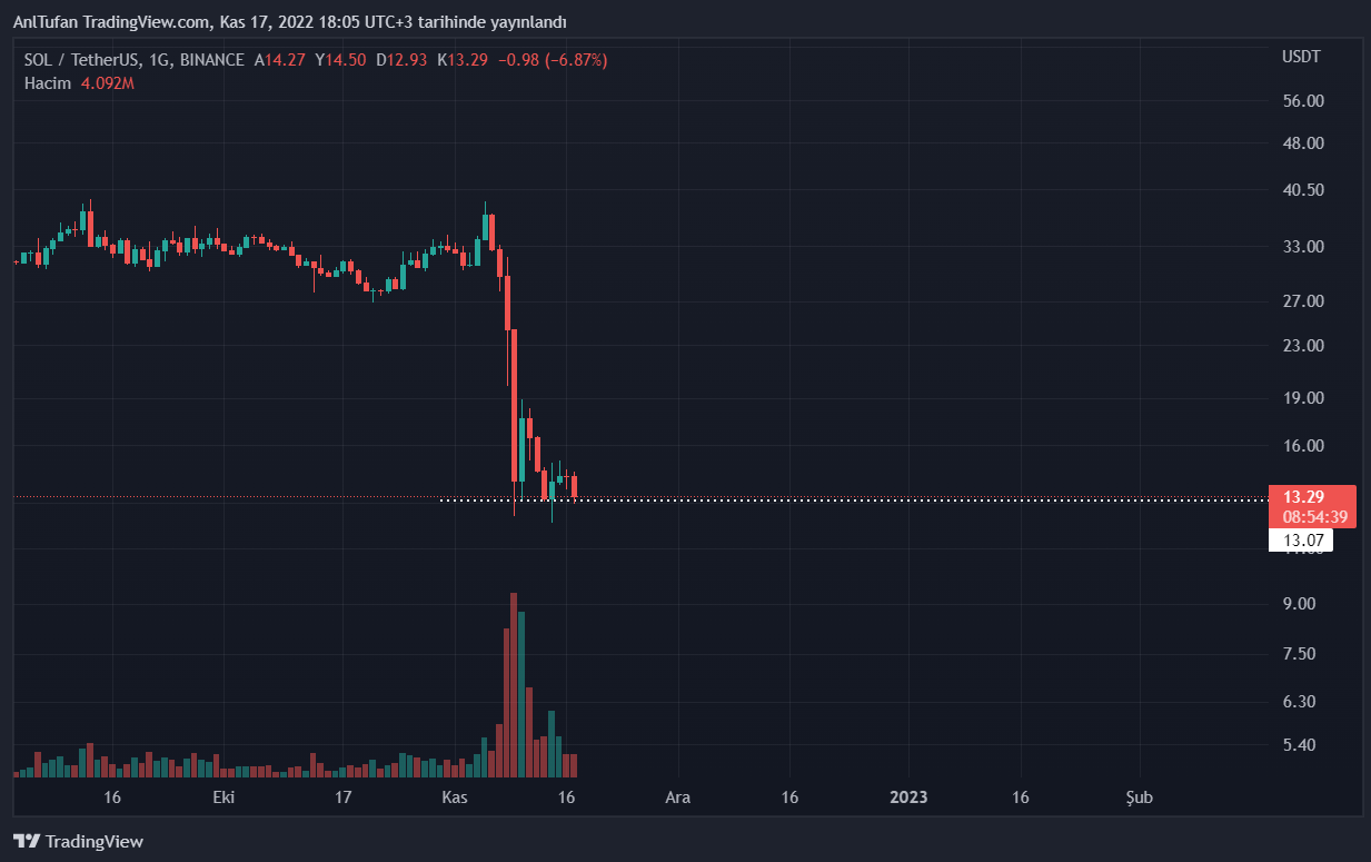 Haberimizin yazıldığı esnada 13 dolar seviyelerinden işlem gören Solana, bugün itibariyle yüzde 7’den fazla düşüş yaşamış durumda.