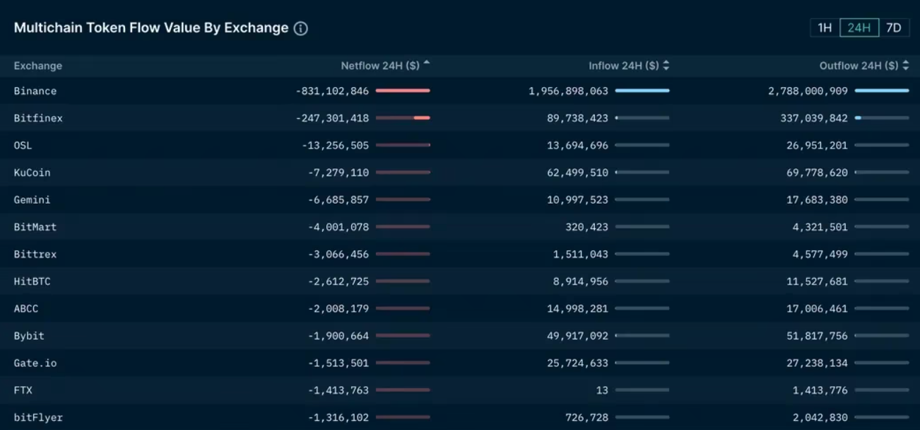 Blockchain istihbarat firması Nansen’in verilerine göre, ticaret hacmine göre dünyanın en büyük kripto borsası olan Binance’den son 24 saat içinde yaklaşık 831 milyon dolarlık net kripto varlık çıkışı yaşandı.