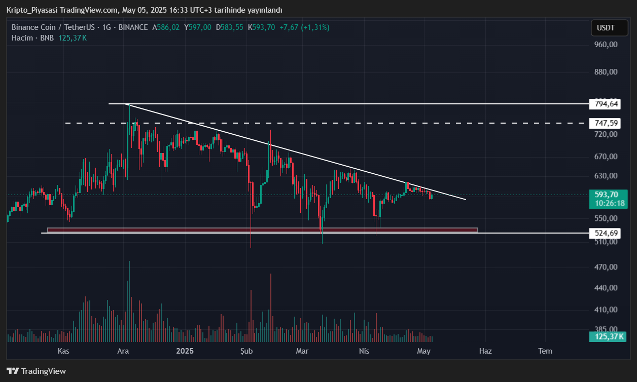 Şuan itibariyle BNB, kritik bir düşen trendine ulaştı. 4 Aralık 2024 tarihinden bu yana bu düşen trendini aşamayan ve her denemesinde ani düşüşler yaşayan BNB, yakında sert bir kırılım yapabilir.