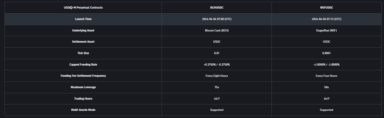 Vadeli USDC piyasasını genişletmeye devam eden Binance, son paylaşılanlara göre WIF ve BCH isimli altcoin’i USDC paritesiyle 50 ve 75 kata kadar kaldıraçla vadeli listeliyor.