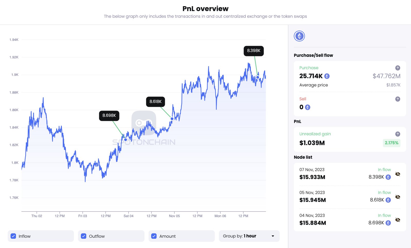 “Akıllı balina 0xb15, yaklaşık 6 saat önce dev kripto para borsası Binance’den 1.897 dolar ortalamasıyla toplamda 8.398 adet ETH (15.9 milyon dolar değerinde) daha satın aldı.