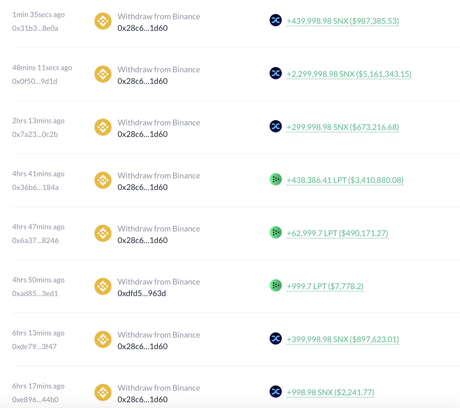 Yeni oluşturulan bir adresin son 6 saat içinde Binance‘ten 3,44 milyon adet SNX (7,72 milyon dolar değerinde) ve 502,385 adet LPT (3,9 milyon dolar değerinde) satın aldığını ettik.”