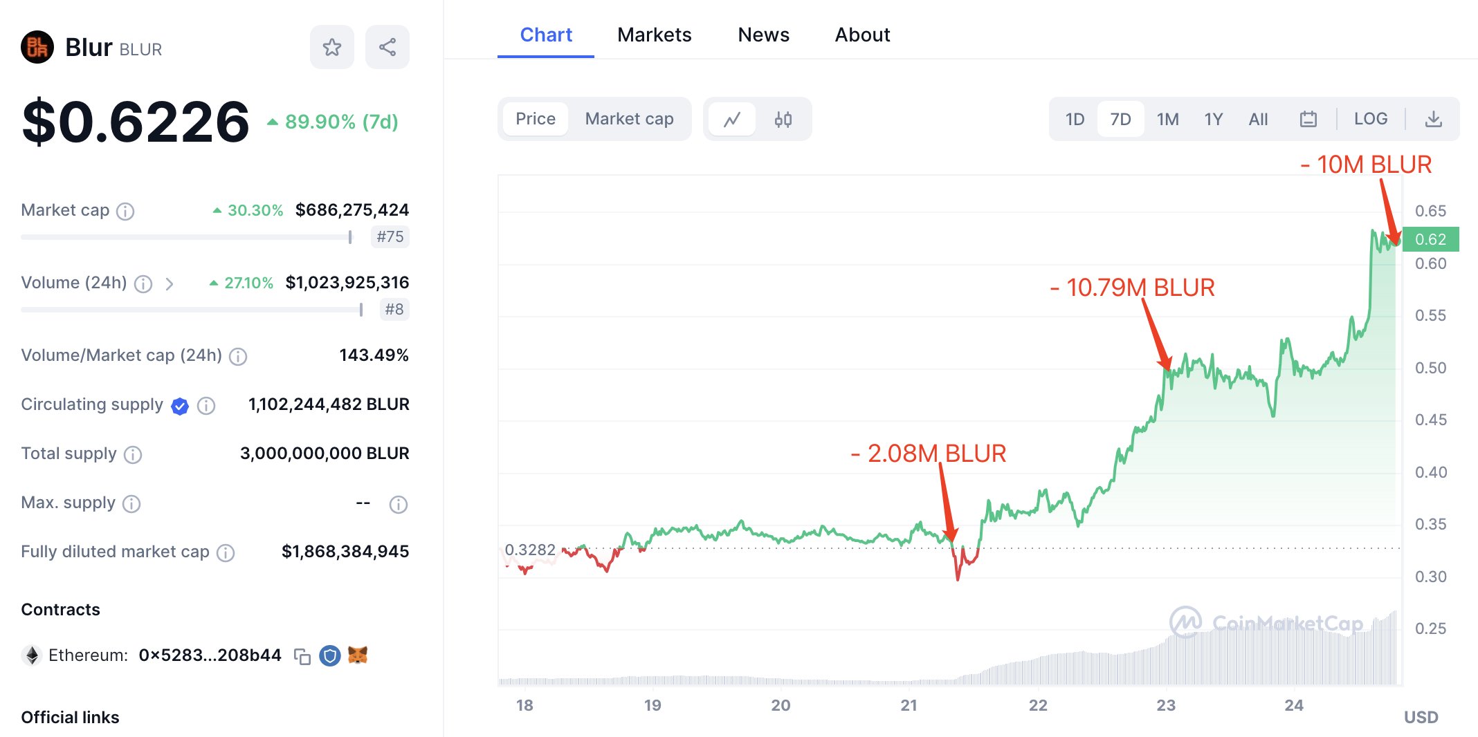 Hanwe.eth, daha önce de airdrop’tan aldığı BLUR’ları borsalara yatırmıştı. Hanwe.eth şimdiye kadar 22,85 milyon adet BLUR’un tamamını borsalara yatırdı.”