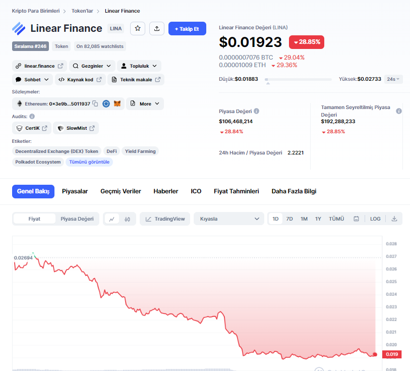 Haberimizin yazıldığı esnada 0.019 dolar seviyelerinden işlem gören LINA, bugün yaşadığı yüzde 30’luk düşüşü ilerleyen süreçte telafi edebilecek mi? bilinmiyor..