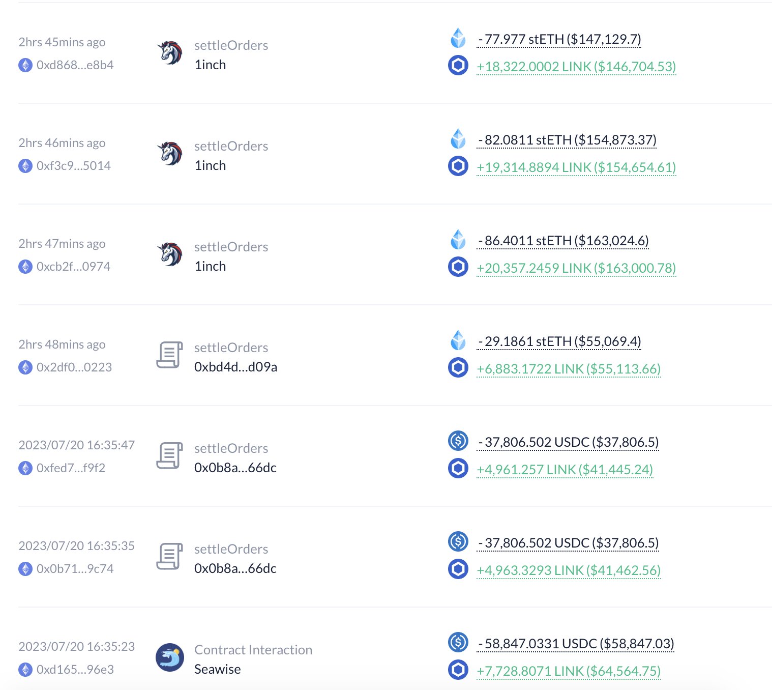 “Bir balina 2 saat önce ortalama 8,06 dolar fiyatla 411,142 LINK satın almak için 1,757 adet stETH (3,3 Milyon dolar değerinde) harcadı.”