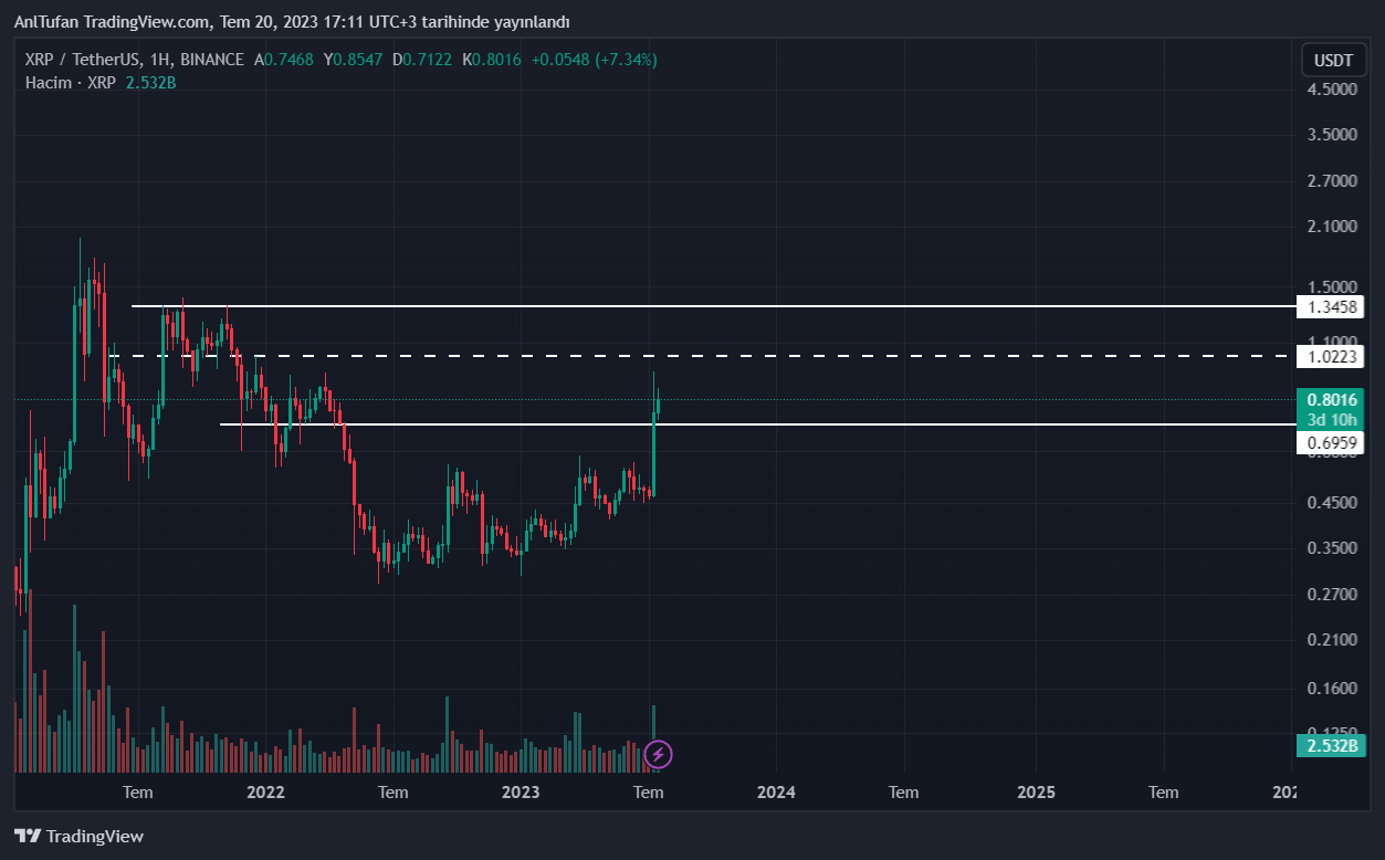 1 gün içerisinde yüzde 100’lük bir yükseliş yaşayarak 0.94 dolar seviyelerini gören XRP, haberimizin yazıldığı esnada ise 0.80 dolar seviyelerinden işlem görüyor.
