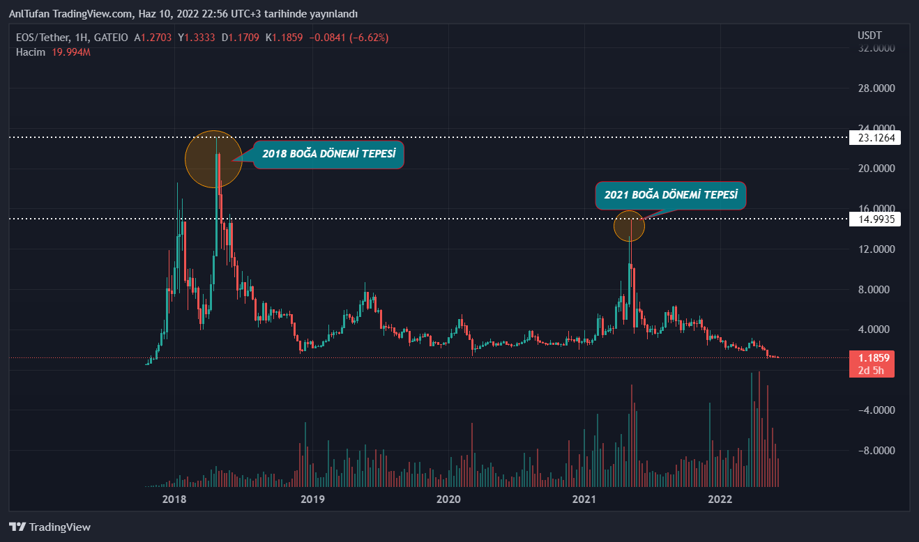 Birçok altcoin gibi 2018 yılındaki ATH seviyesi olan 23 dolara ulaşamayan EOS, son döngüde 15 dolar seviyelerini görmeyi başardı.