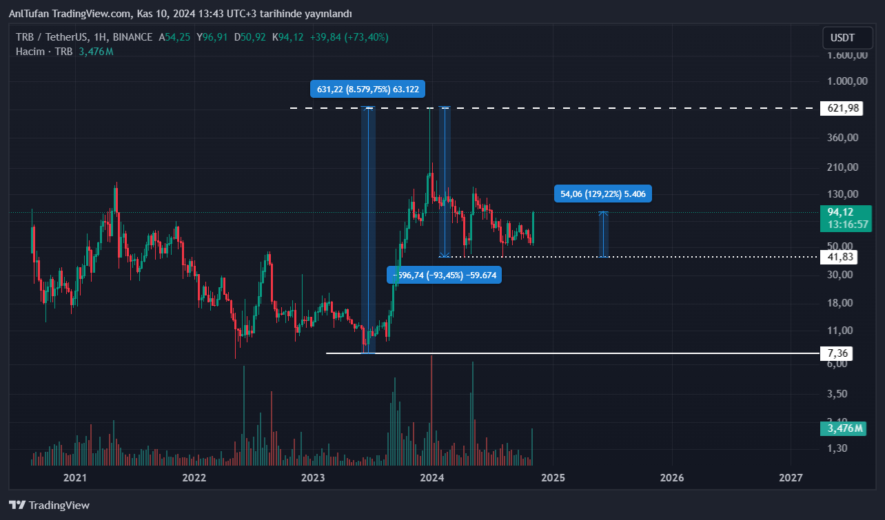 Son süreçte ise 40 dolarda dip yapan ve tekrardan yükselişe geçen TRB, haberimizin yazıldığı esnada 94 dolardan işlem görüyor.