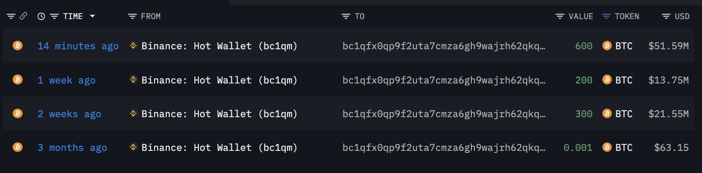 Balina “bc1q…67rc” 15 dakika önce Binance’den 600 adet BTC (51.59 milyon dolar değerinde) daha çekti.