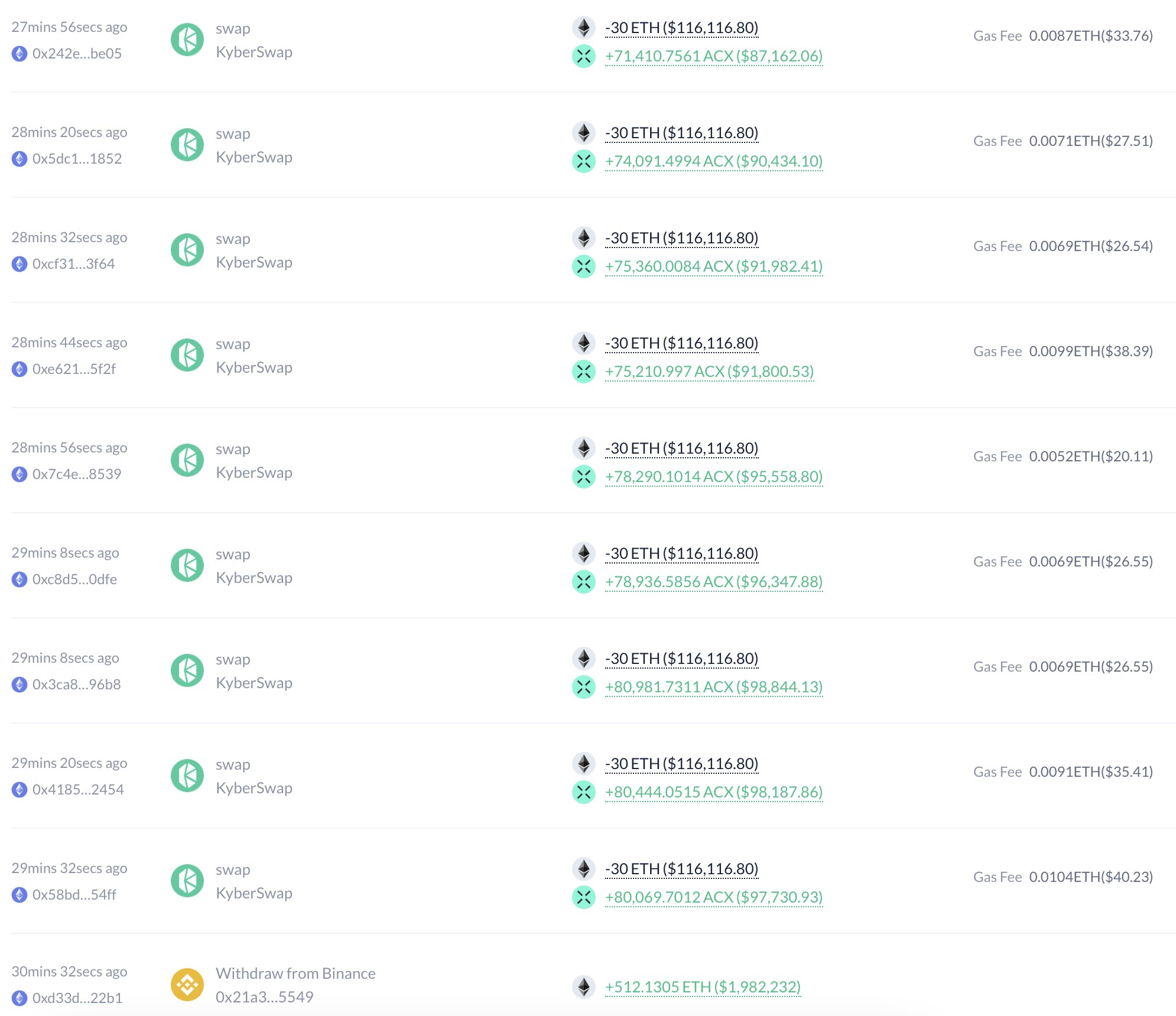 Binance’in ACX’i listelediğini duyurmasının ardından bir balina, Binance’ten 512 adet ETH (1,98 milyon dolar değerinde) çekerek DEX’te 1,56 dolardan 1,27 milyon adet ACX satın aldı.