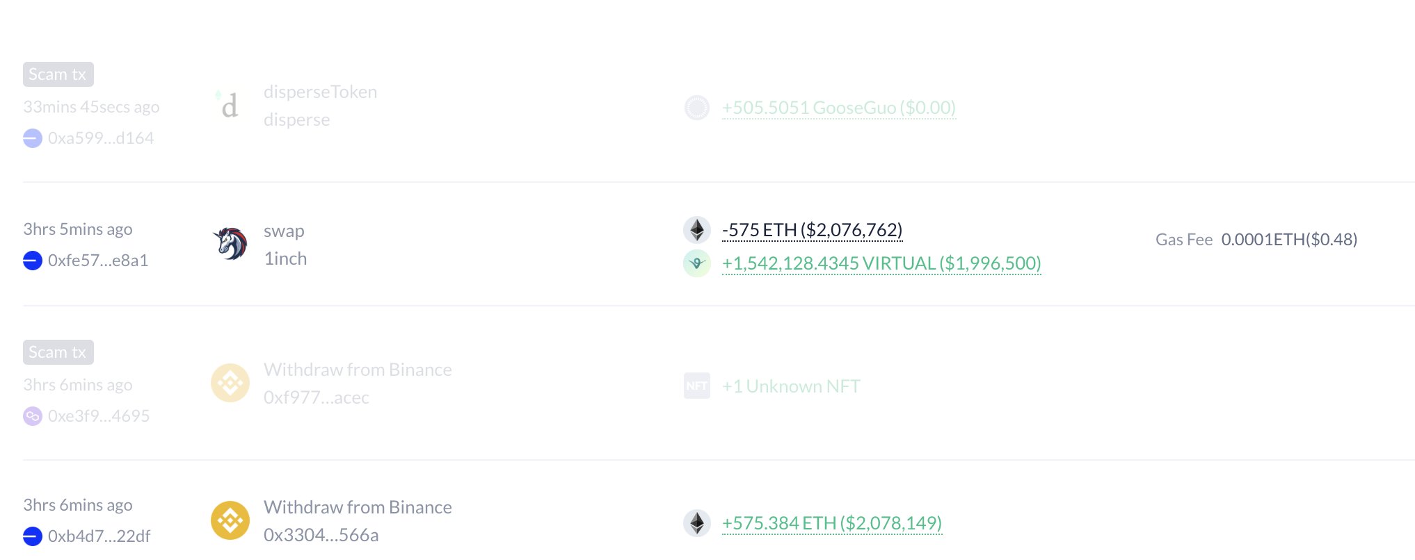 Bazı kripto balinaları bu süreçte dijital varlık satışı yaparken bazıları ise alım yapıyor. Başarılı bir zincir içi veri sağlayıcısı olan Look On-Chain, kısa bir süre önce VIRTUAL satın alan bir balina keşfetti.