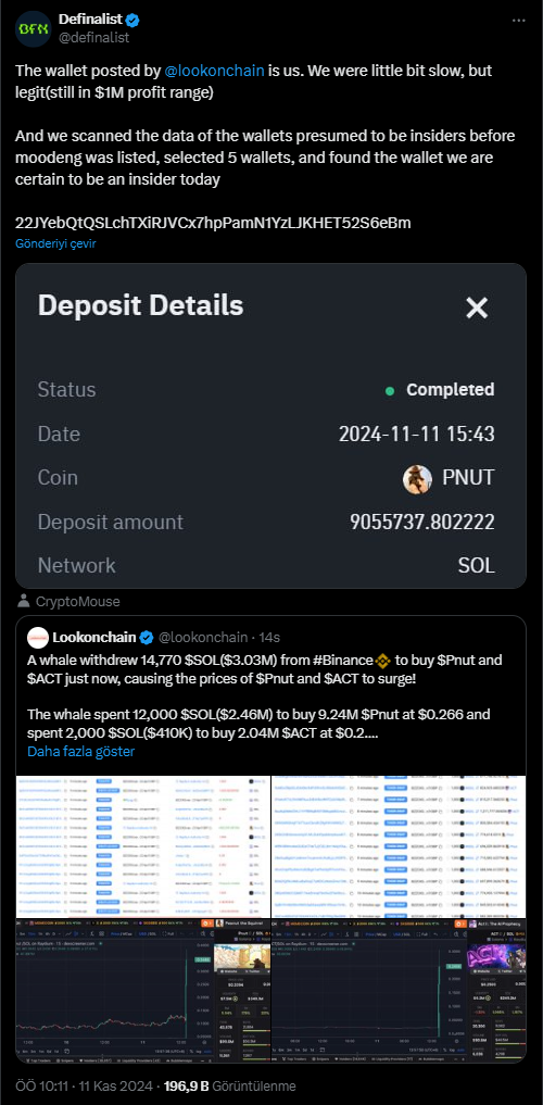 Bugün itibariyle başarılı bir araştırmacı olan Definalist ve Look On-Chain, bazı Insider Memecoin ticaretleri tespit etti. Uzmanlara göre bir tüccar Binance’in Peanut the Squirrel‘i (PNUT) listeleyeceğini önceden biliyordu.
