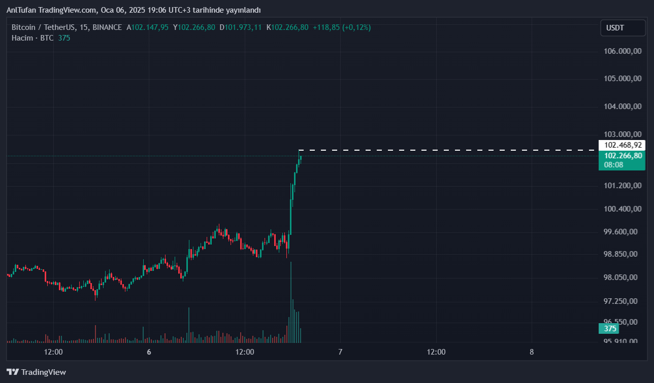 Bitcoin son yaşadığı yükselişler ile birlikte kısa bir süre önce Binance spot piyasada 102.468 dolar seviyelerine kadar yükseldi. 100 bin doların kırılması, BTC’deki alıcı baskısının da artmasını sağladı.