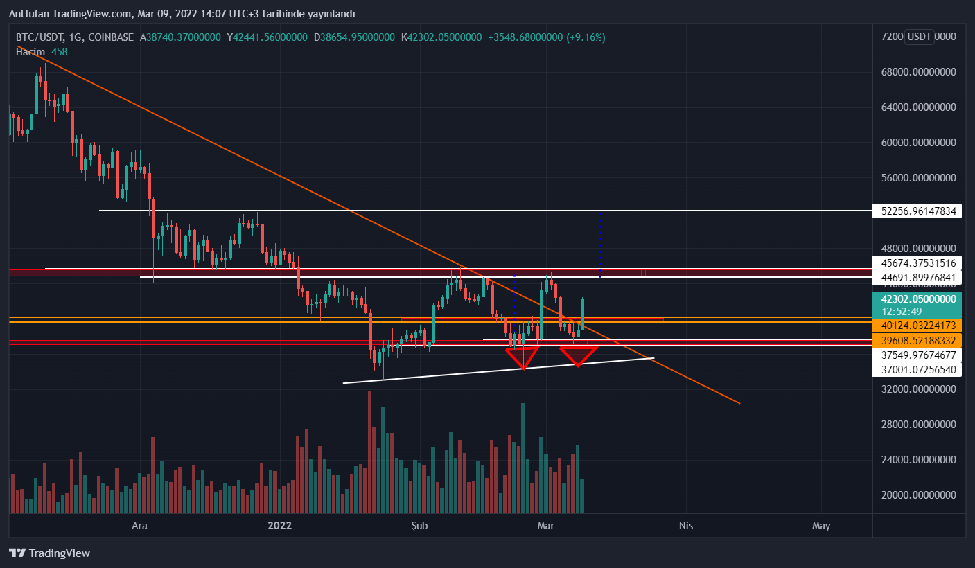 28 Şubat tarihinde günlük grafikte bulunan düşen trendini kırmayı başaran BTC, yine bir 45.000 dolar denemesi yapmış başarısız olmuştu. Bu başarısızlık ardından düşüşe başlayan lider kripto para 37.168 dolar seviyelerini dahi gördü.